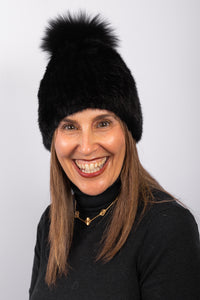 Hit the slopes with this fun hat. The stretch in the knit allows for comfort as well as adjustable sizing. The fox pom pom pairs nicely with the texture of the mink. This chic look is a great gift item for all ages.