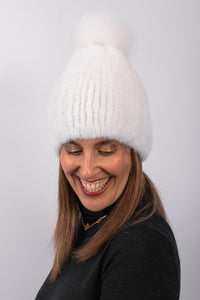 Hit the slopes with this fun hat. The stretch in the knit allows for comfort as well as adjustable sizing. The fox pom pom pairs nicely with the texture of the mink. This chic look is a great gift item for all ages.