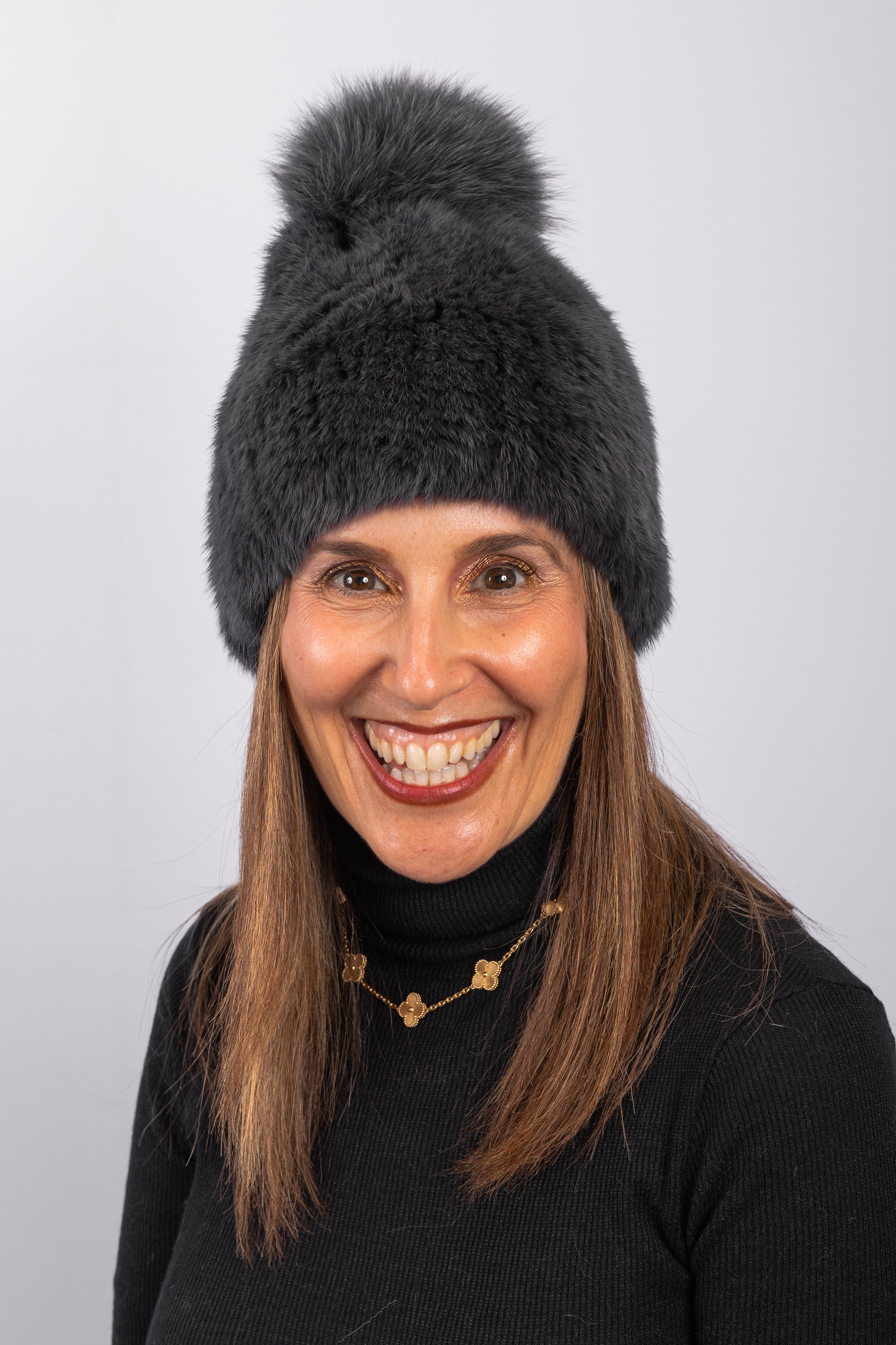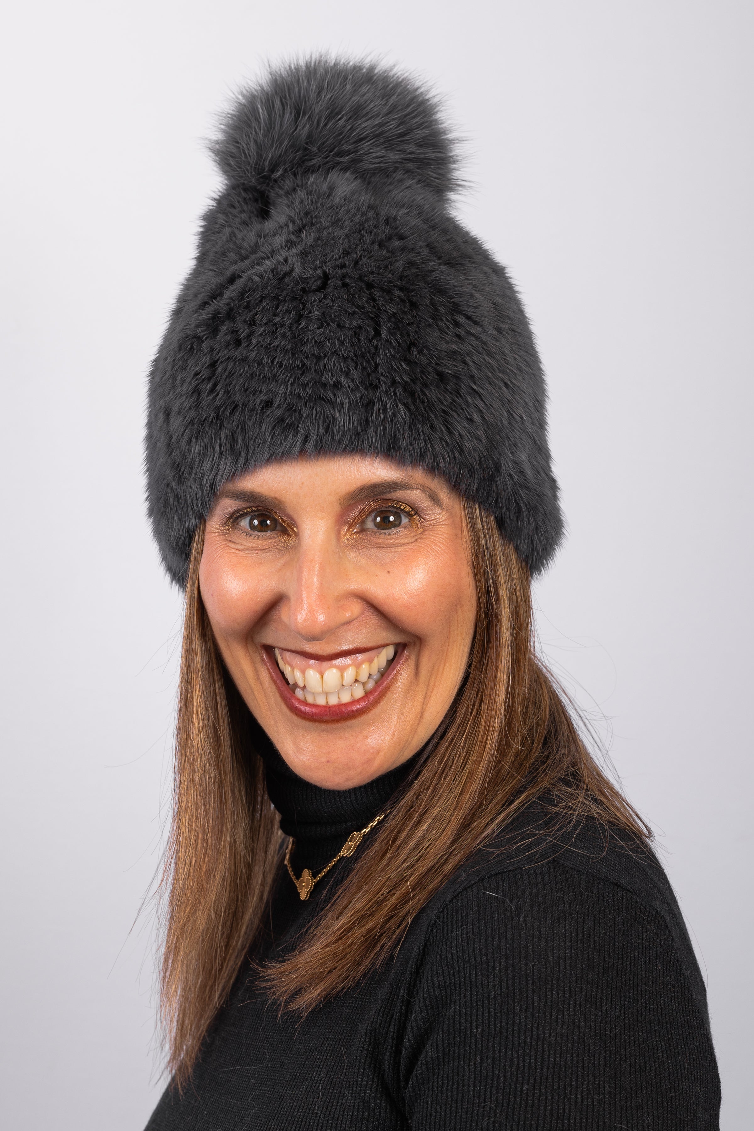 Hit the slopes with this fun hat. The stretch in the knit allows for comfort as well as adjustable sizing. The fox pom pom pairs nicely with the texture of the mink. This chic look is a great gift item for all ages.