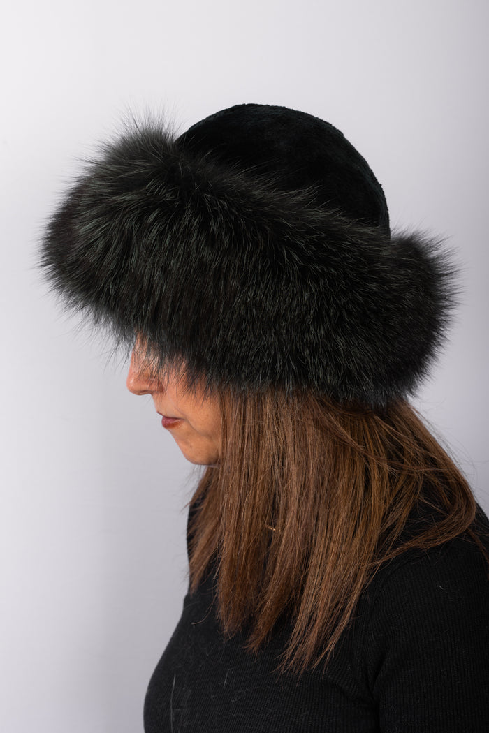 Black Sheared Beaver Hat with Black Fox Fur Trim