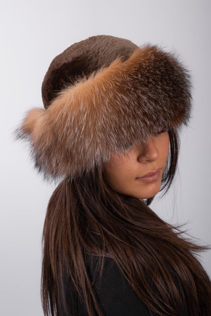 Espresso Sheared Beaver Hat with Crystal Fox Fur Trim