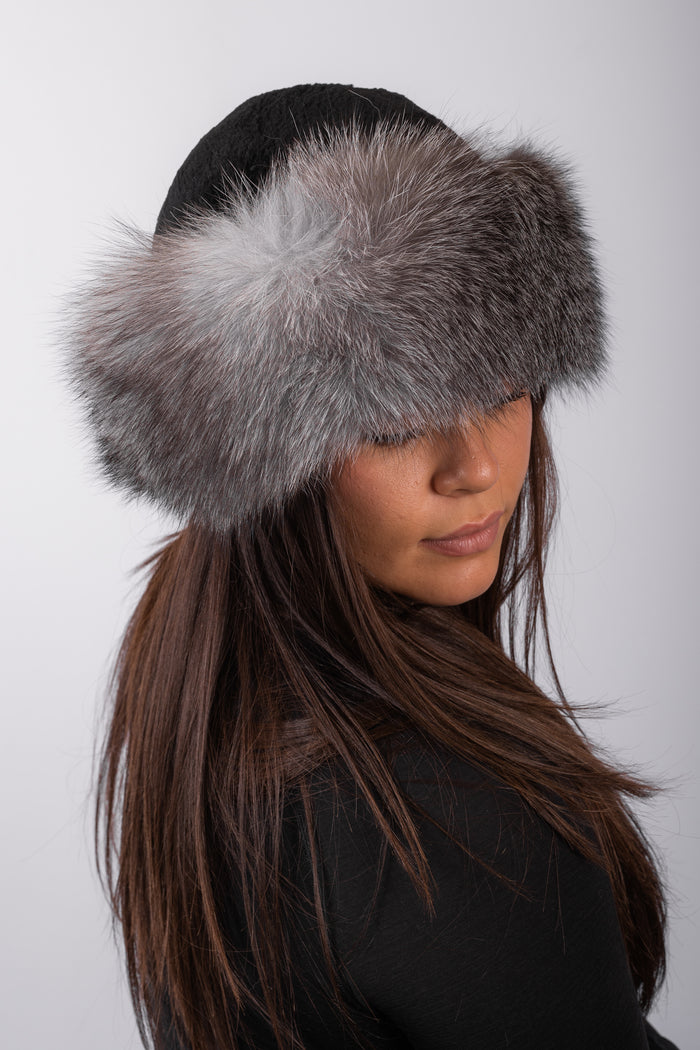 Black Sheared Beaver Hat with Indigo Fox Fur Trim