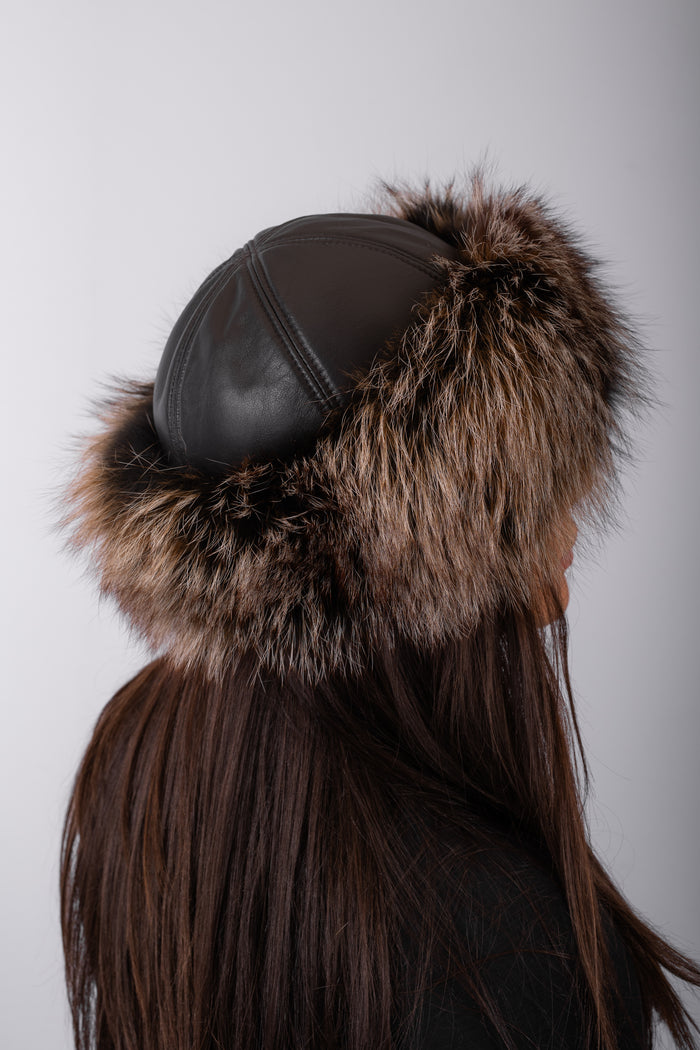 Espresso Lamb Leather Hat with Amber Frost Fox Fur Trim