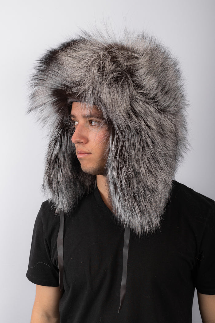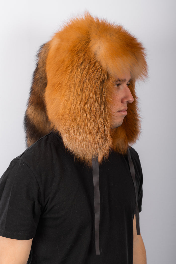 Natural Grey Fox Musher Hat with Red Fox Fur Trim