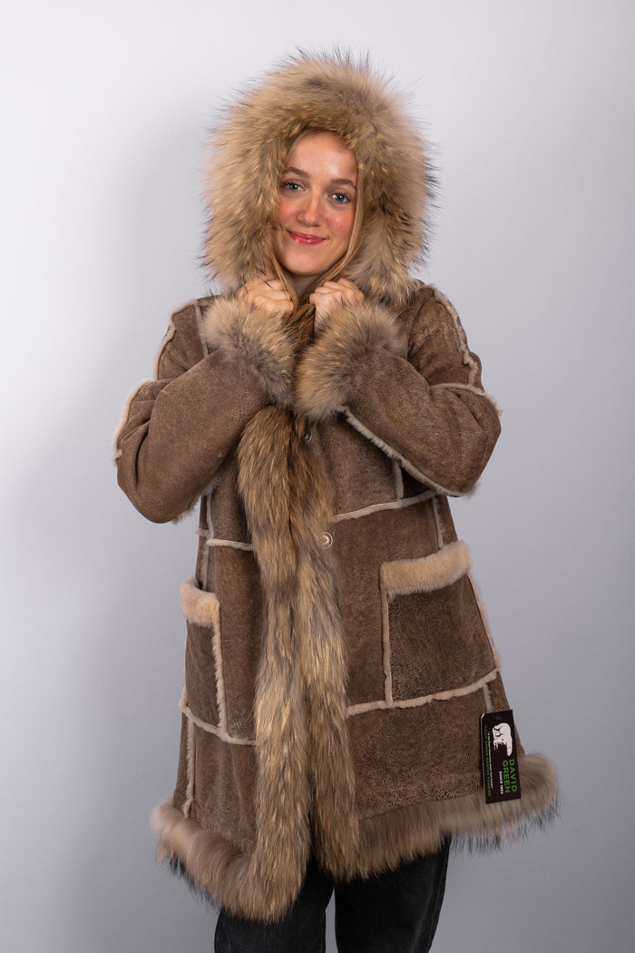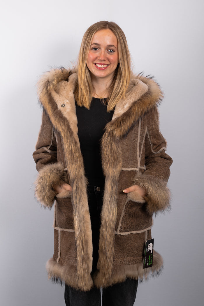 Cappuccino Shearling Lamb Jacket with Natural Asiatic Raccoon Fur Trim