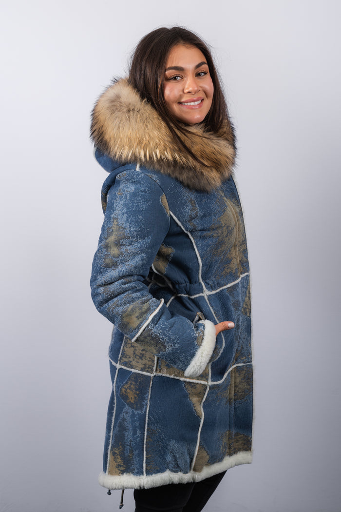 Distressed Denim Shearling Lamb/Natural Asiatic Raccoon Coat