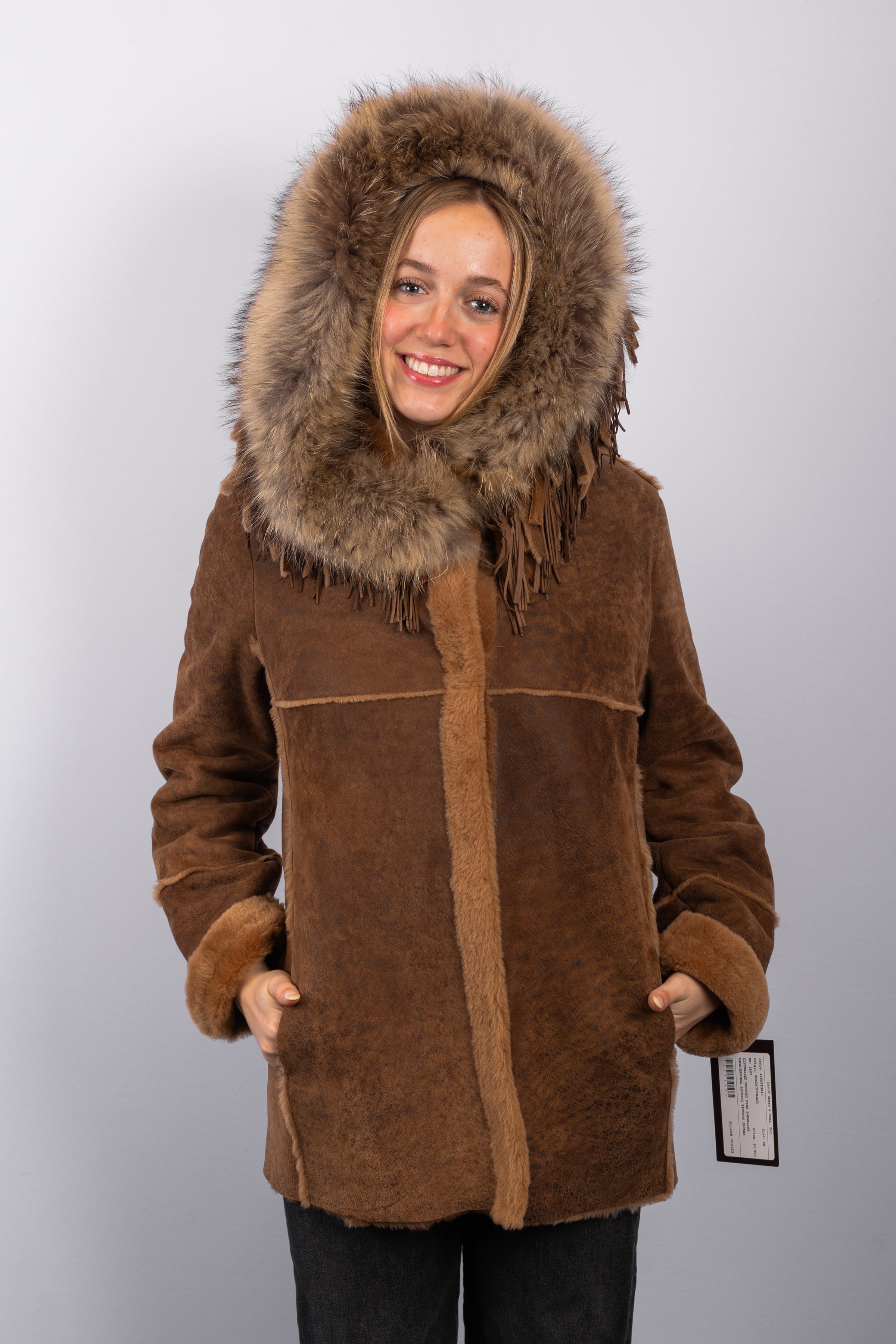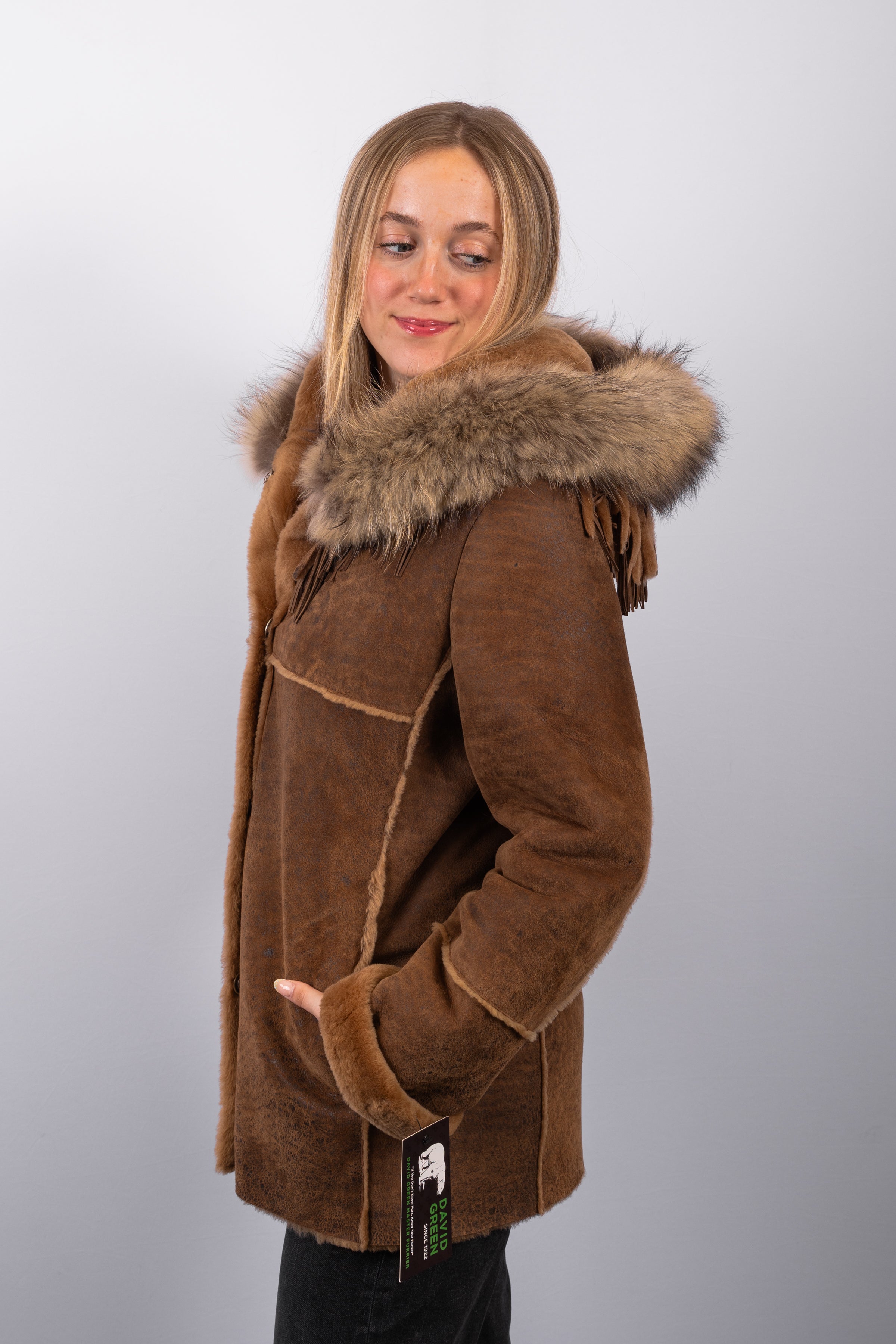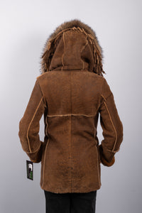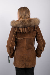 Edgy and luxurious, this Distressed Whiskey shearling lamb jacket combines rugged style with refined details. Crafted from soft, distressed whiskey-colored shearling lamb, it features a hood trimmed with natural Asiatic raccoon fur for added texture and warmth. Leather tassels accent the design, adding a playful, fashion-forward touch, while snap closures provide easy, functional wear. Perfect for chic, casual layering with a statement-making edge.