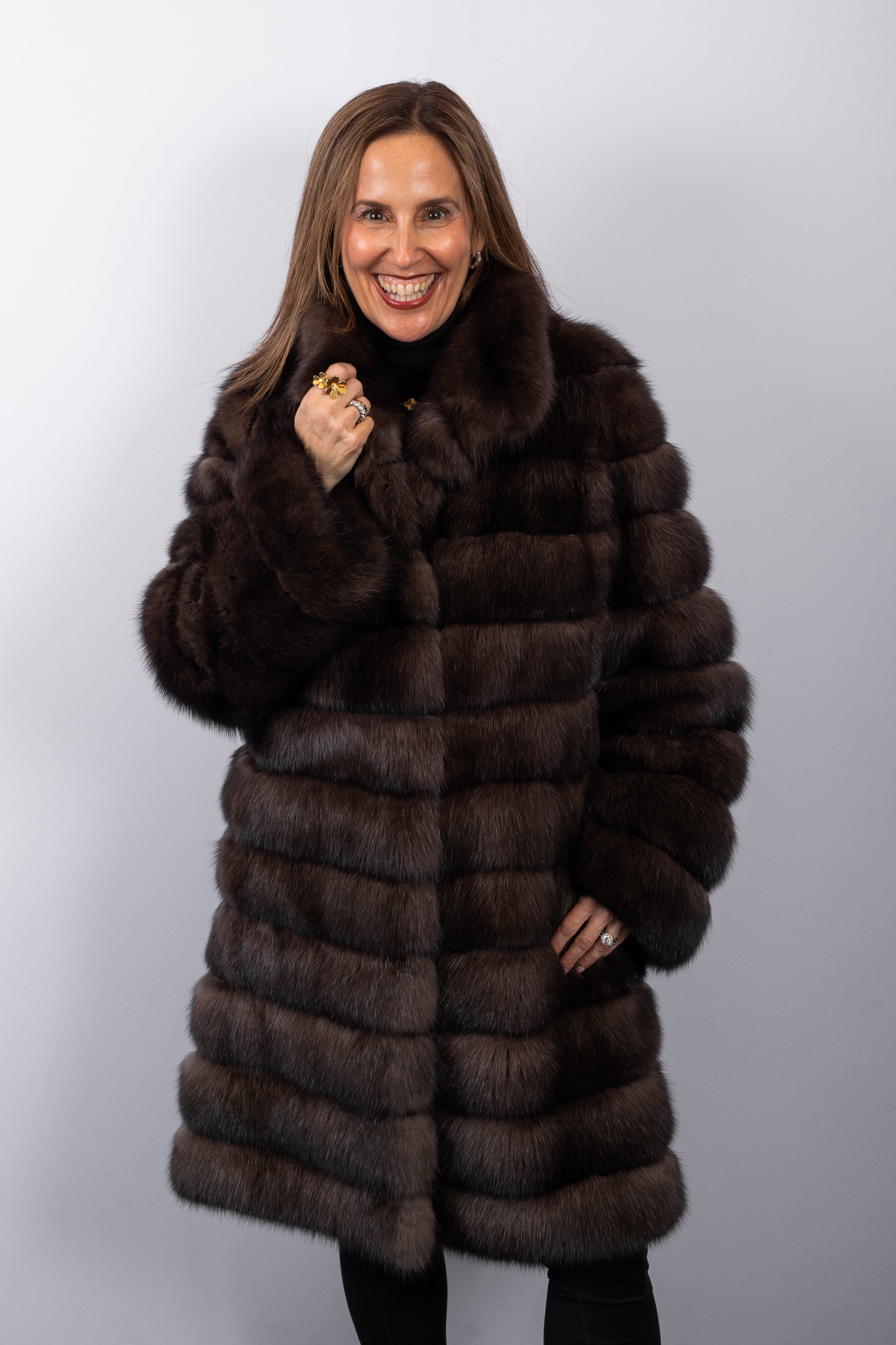 Elegant and timeless, this natural Russian sable jacket showcases the exceptional quality of the pelt, distinguished by its naturally luminous silver-tipped guard hairs. Crafted from plush, silky sable, the design features a refined wing stand-up collar that adds architectural sophistication to the silhouette. Finished with discreet keska closures, the jacket offers seamless elegance, exceptional warmth, and effortless luxury for both day and evening wear.