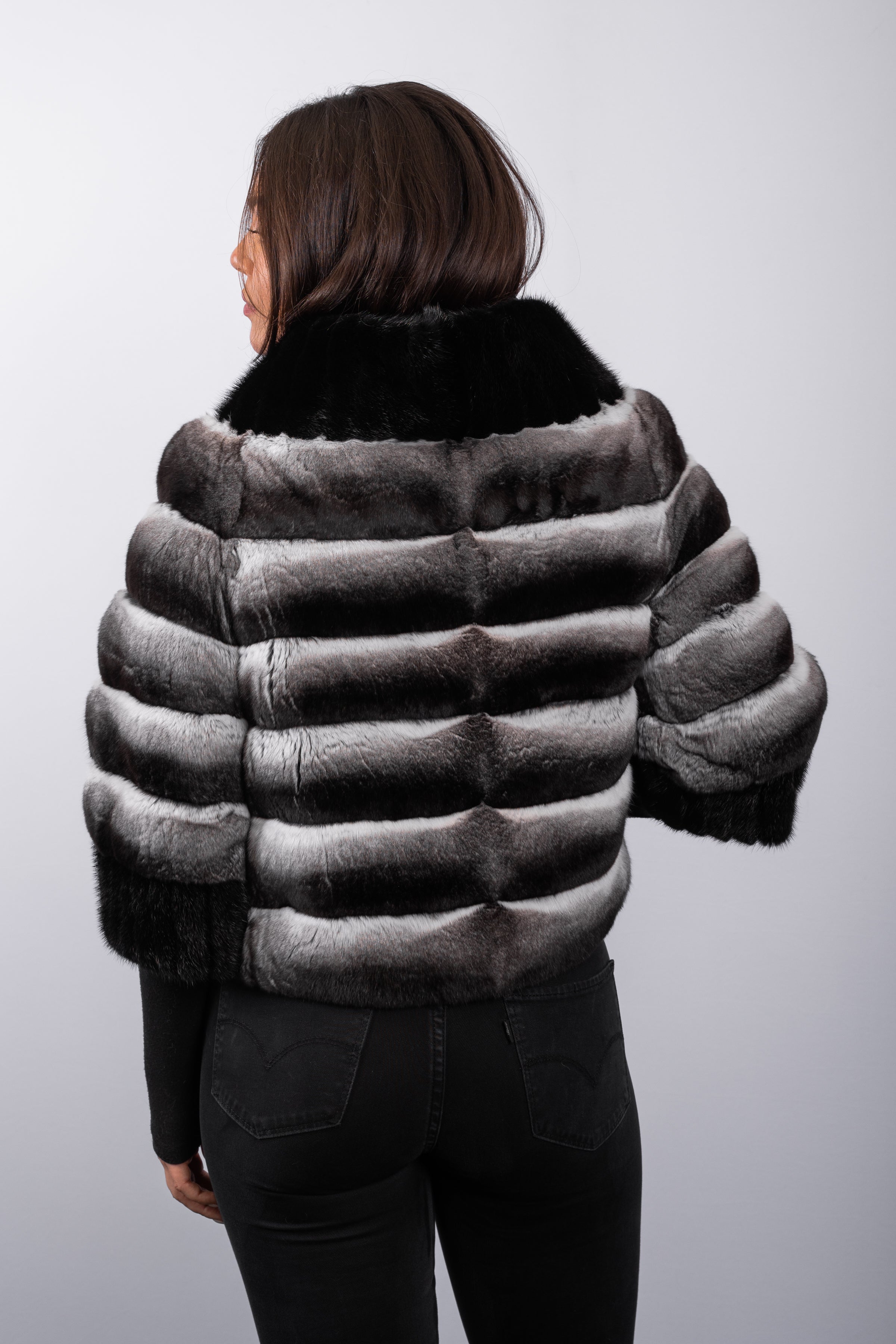 Natural Chinchilla Jacket with Black Mink Fur Trim - 3/4 Sleeve