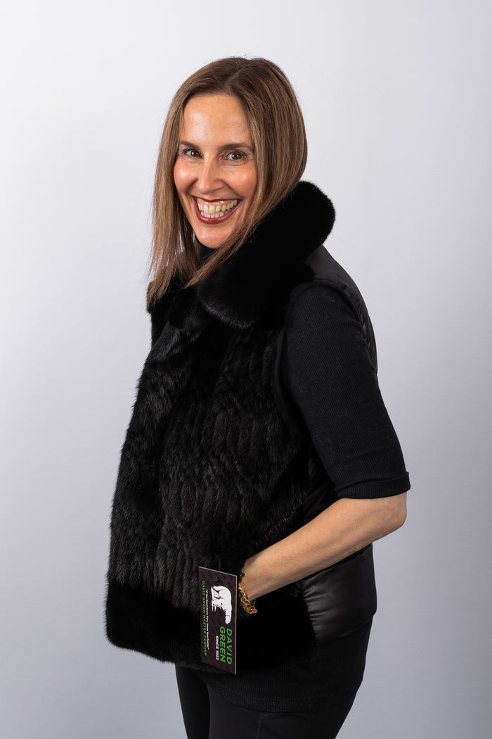 Natural Mocha Mink/Black Lamb Leather Vest with Mocha Silver Fox Fur Trim