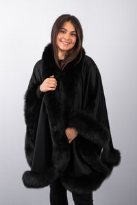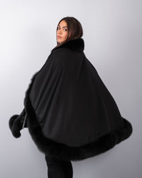Black Cashmere Cape with Black Fox Fur Trim - Long