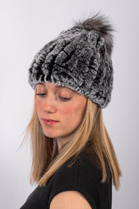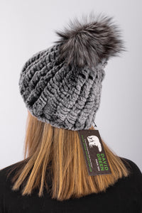 Hit the slopes with this fun hat. The stretch in the knit allows for comfort as well as adjustable sizing. The fox pom pom pairs nicely with the texture of the rex rabbit. This chic look is a great gift item for all ages.