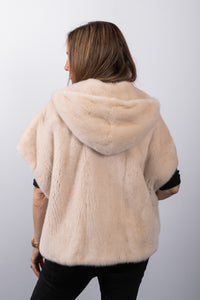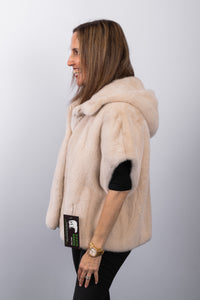 Luxuriously versatile, this champagne pearl mink vest offers two stylish looks in one. The plush mink side exudes elegance and sophistication, while the reversible fabric side provides a casual, contemporary option. Designed with a cozy hood, keska closures on the mink side, and button-and-loop closures on the fabric side, this vest combines functional details with refined style for effortless layering.