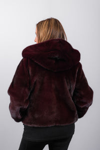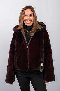 Elevate your outerwear with this luxurious merlot mink jacket, fully reversible to a sleek, army-colored, weather-resistant fabric. Slightly cropped for a modern silhouette, it features a cozy hood, zipper front, and adjustable drawstring hem, making it perfect for a glamorous night out or a stylish day on the slopes.