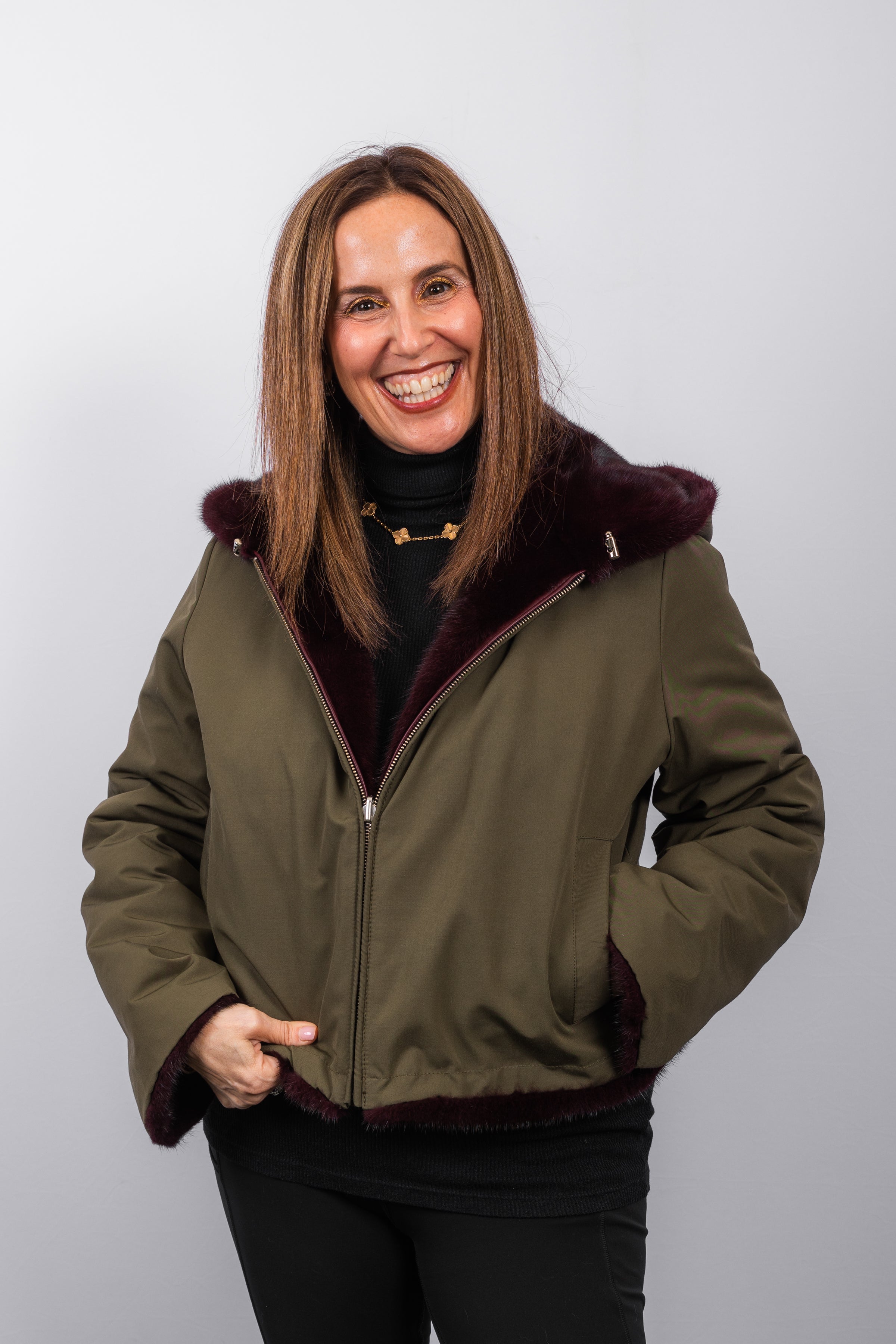 - Rich merlot mink with army-colored weather-resistant reverse