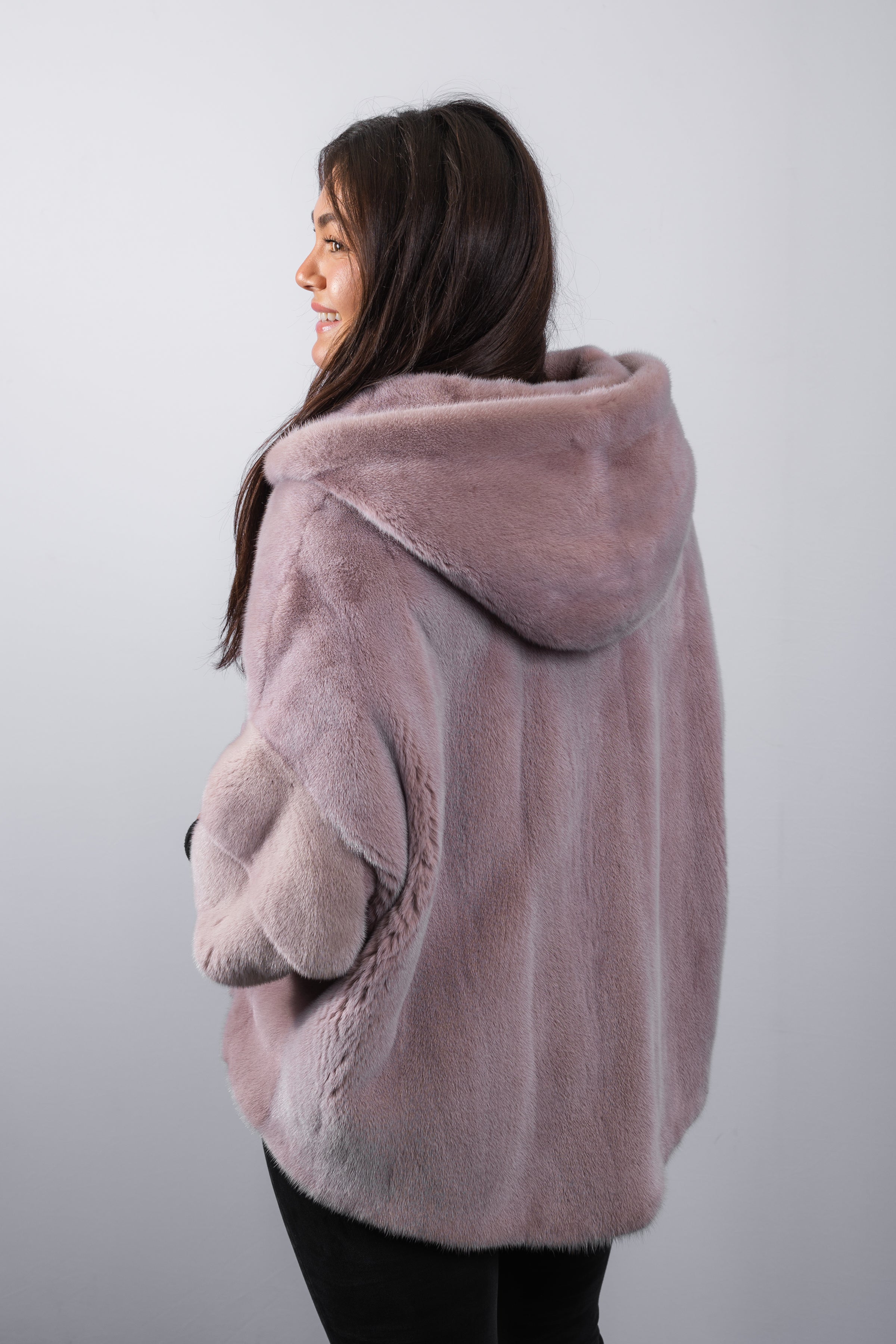 Soft and elegant, this lilac frost mink jacket brings a fresh, refined touch to luxury outerwear. Crafted from silky mink, it features keska closures for a clean, seamless finish, along with a cozy hood for added warmth and style. The 3/4-length sleeves create a modern silhouette that’s both comfortable and flattering. Lightweight yet naturally warm, this jacket is perfect for effortless day-to-night wear.