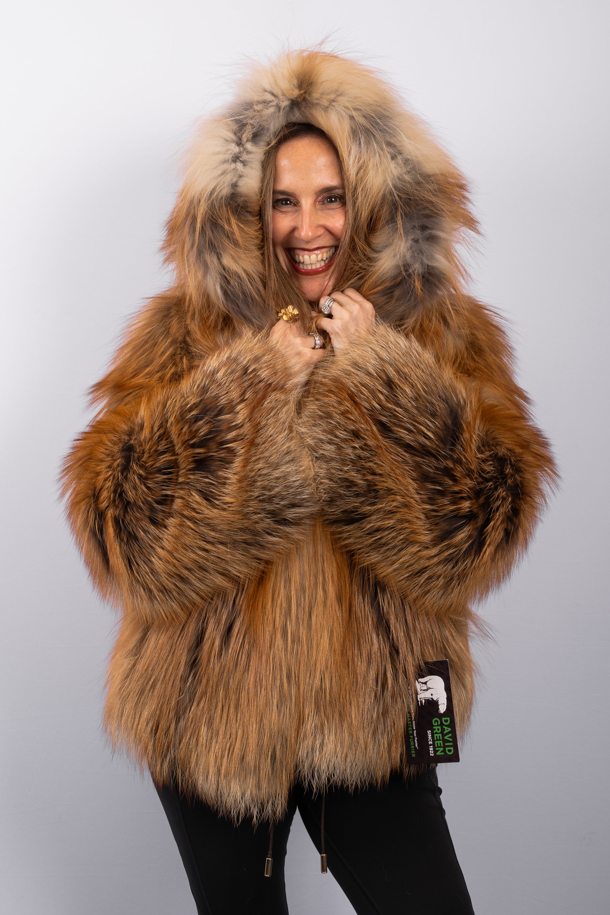 Vibrant and luxurious, this natural red fox jacket exudes timeless elegance and modern style. Crafted from plush, silky red fox fur, it features a cozy hood for added warmth and a polished silhouette. Finished with refined keska closures, the jacket offers a seamless, sophisticated look while providing natural insulation—perfect for both casual and elevated ensembles.