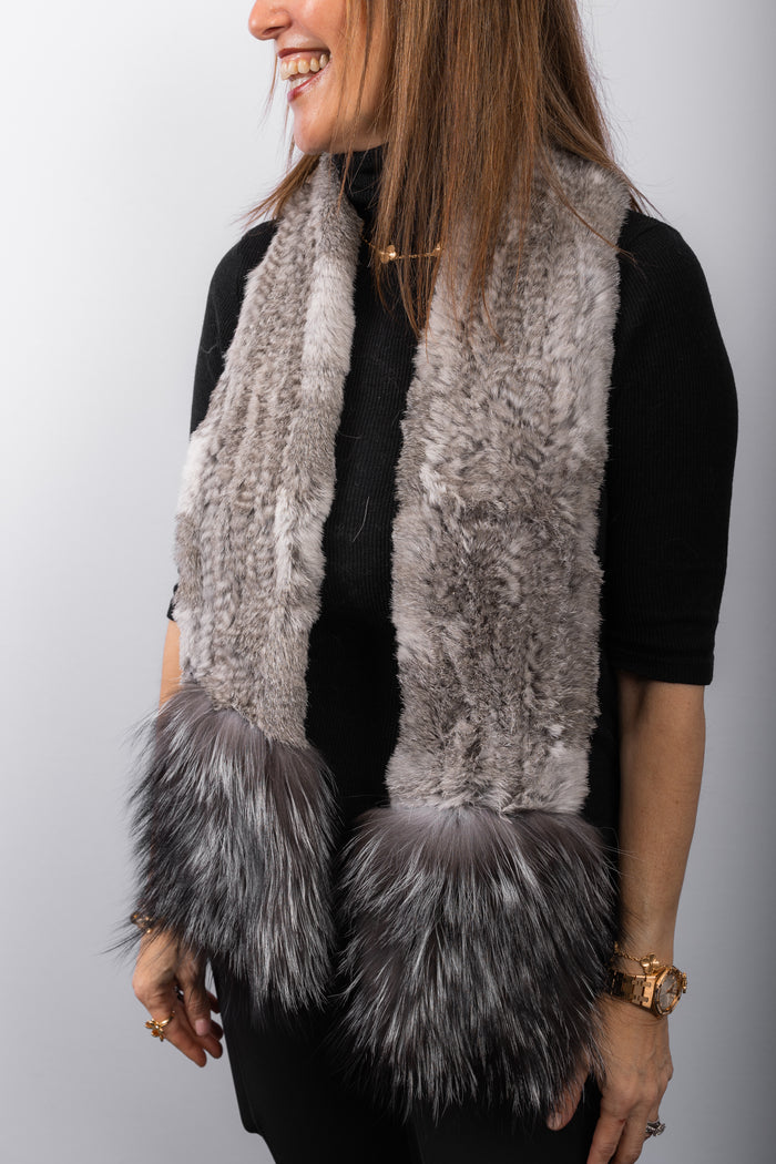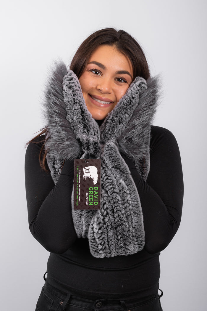 Chinchilla Rex Rabbit Scarf with Silver Fox Fur Trim - Mitten
