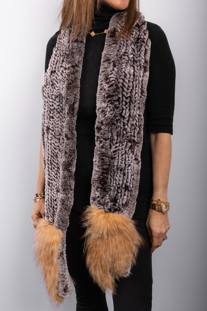 Toffee/Chinchilla Rex Rabbit Scarf with Red Fox Fur Fringes
