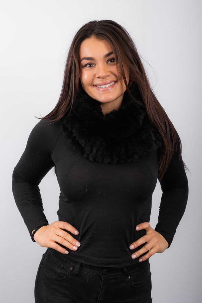 Black Rex Rabbit Scarf with Black Fox Fur Trim - Mitten