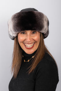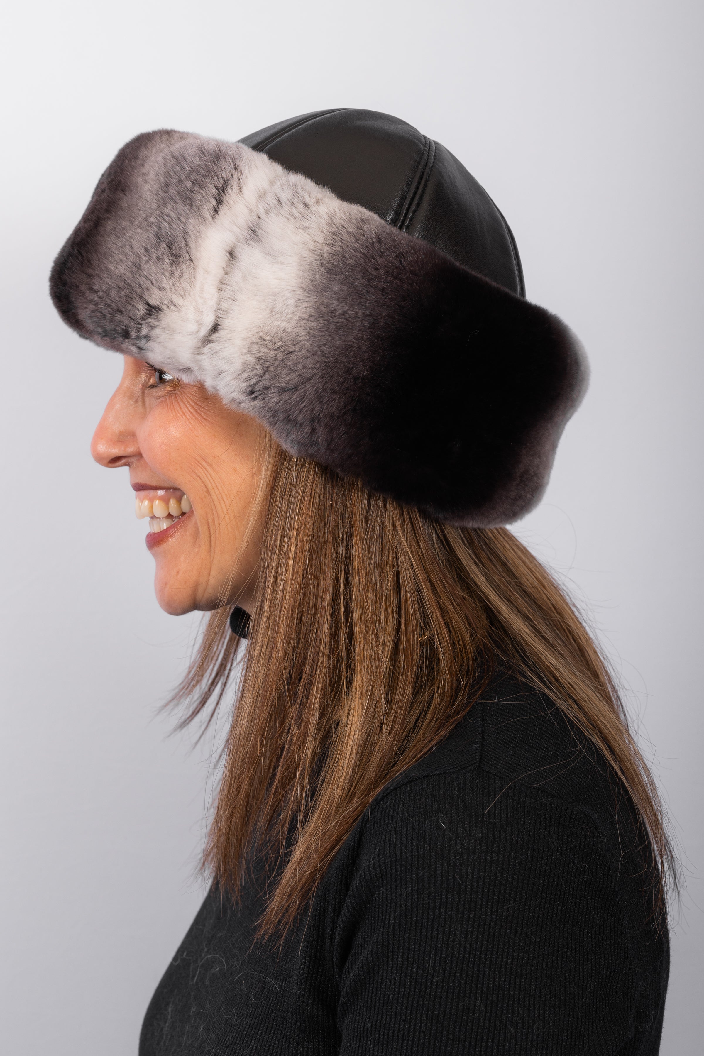 Black Lamb Leather Hat with Chinchilla Rex Rabbit Fur Trim