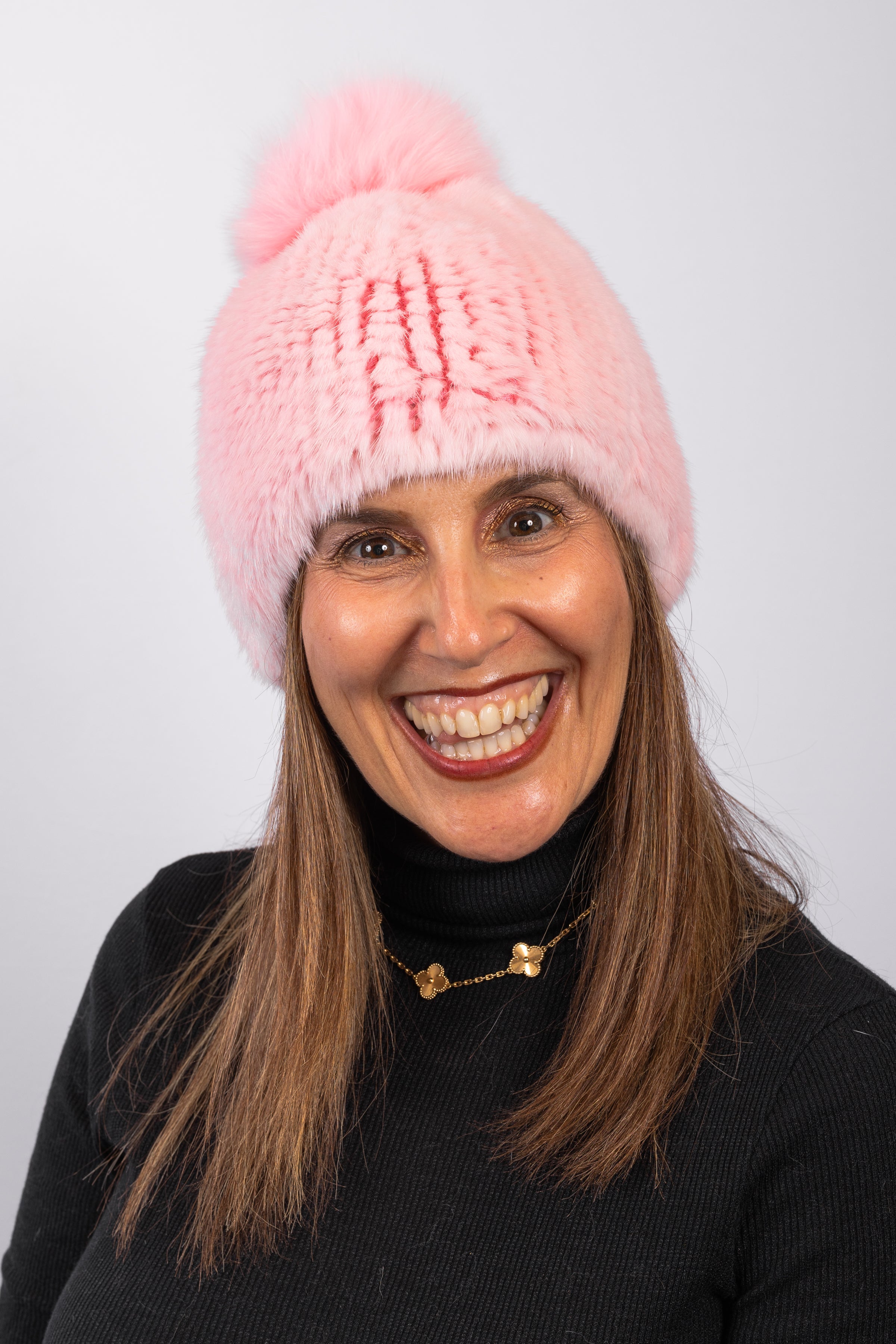 Hit the slopes with this fun hat. The stretch in the knit allows for comfort as well as adjustable sizing. The fox pom pom pairs nicely with the texture of the mink. This chic look is a great gift item for all ages.